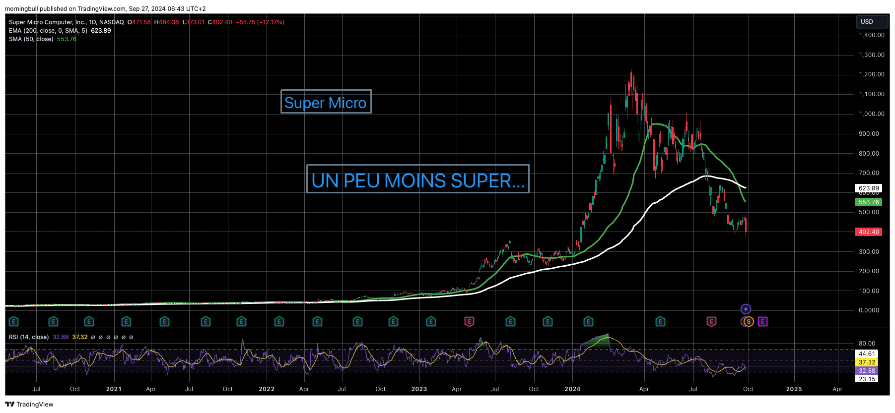 Au-delà de l’histoire chinoise, nous avons eu également droit à pas mal de bruit du côté de l’intelligence artificielle, des semiconducteurs et de Super Micro qui n’est soudainement plus aussi « super ». Hier nous avons donc fêté les EXCELLENT CHIFFRES de Micron et sa guidance dithyrambique sur l’IA pour ces prochains mois. Tous les titres liés au secteur ont donc pris l’ascenseur, Nvidia en tête de pont, puisque le KING of AI a immédiatement ouvert au-dessus de sa résistance qui lui pèse sur le crâne depuis des semaines. Micron prenait 20% et l’amour de l’intelligence artificielle était définitivement dans le pré. Et puis le Wall Street Journal a publié un article qui déclarait que le Département de la Justice avait lancé une enquête sur Super Micro, afin de comprendre quelles sont les magouilles misent en place dans leur comptabilité. Dès lors, la fête organisée par Micron a été partiellement gâchée. Il est vrai que l’enquête du DOJ rappelle un peu trop celle lancée contre Enron et Worldcom à l’époque. On ne peut pas s’empêcher de se souvenir comment cela s’est terminé. Et on ne pouvait pas non plus oublier que Super Micro est aussi un gros client/partenaire de Nvidia.