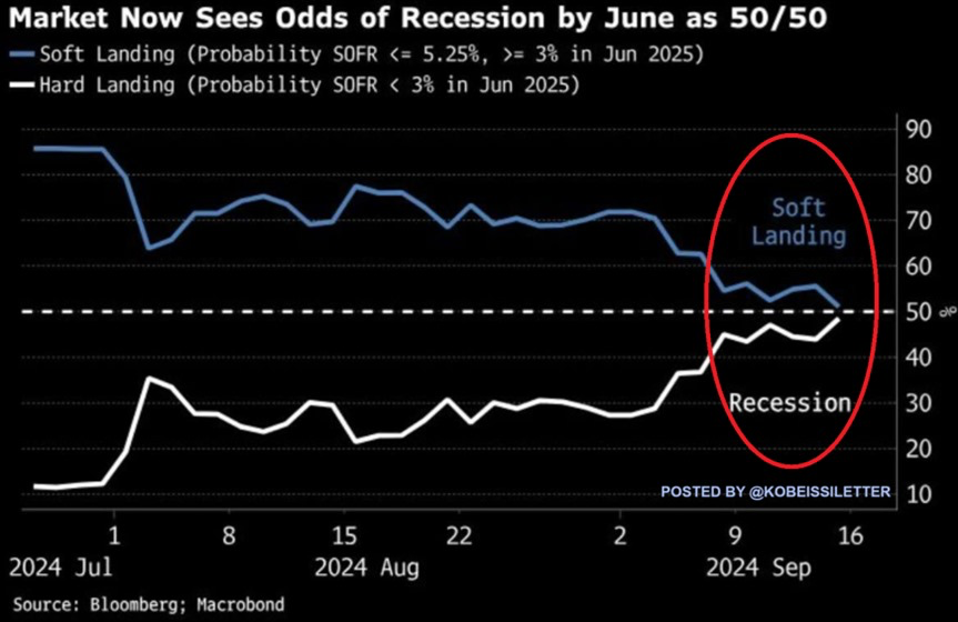 Pour entamer cette semaine, on notera que selon un dernier sondage, le marché estime que désormais la probabilité d’une récession est de 50% d’ici à juin 2025. Ce pourcentage a plus que doublé au cours du mois dernier, alors qu’il n’était que de 10 % en juillet. En outre, on évalue à 50 % la probabilité que la FED « recalibre » ses taux d’au moins 200 points de base au cours des huit prochains mois. À titre de comparaison, la FED prévoit des baisses de taux de 150 points de base d’ici à la fin de 2025. On n’est visiblement pas tous d’accord sur le fait qu’il faut avoir « hyper-confiance ».
