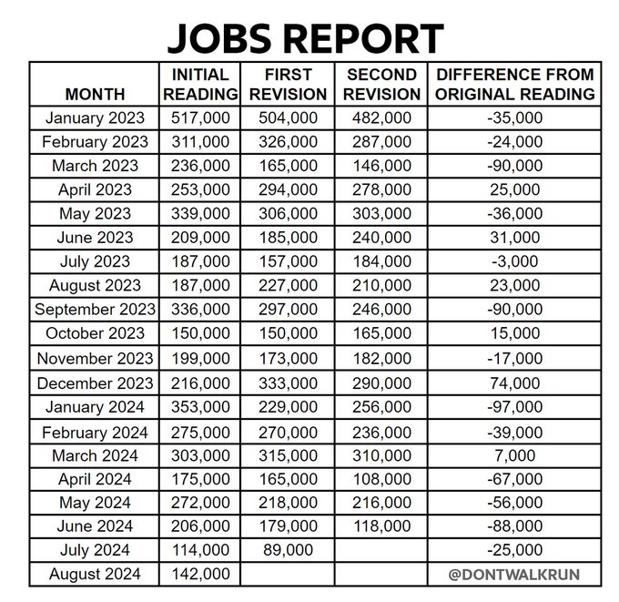 Rien que sur les deux derniers mois, Les NFP’s de juin et de juillet ont été révisés à la baisse pour un total de 86’000 emplois. Les gars se sont ratés de 86’000 – en gros la taille d’un petit stade de football américain dans le pays de Biden. (86’000 jobs volatilisés comme si de rien n’était). Sur juin, nous sommes passé des 179’000 à 118’000 et sur juillet 114’000 à 89’000 ! Moins de 100’000 créations d’emplois au mois de juillet et encore, c’est même pas sûr parce que si ça se trouve, en octobre, ils vont encore taper dans le gras puisque statistiquement – comme on peut le voir sur le tableau ci-dessous ; les chiffres sont révisés deux mois de suite en général.
