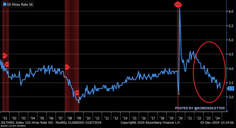 Et c’est pas tout. Non, parce que sinon ça serait trop facile. Selon une autre statistique publiée récemment, il semblerait que les engagements ne soient plus non plus au top de leur jeu. Le nombre d’embauches en pourcentage de l’emploi total est tombé à 3,3 % en novembre, soit le niveau le plus bas depuis 2020. Au cours des trois dernières années, le taux d’embauche a diminué de 1,3 point de pourcentage, soit la plus forte baisse jamais enregistrée. Aujourd’hui, alors que l’Amérique se prépare à être GREAT AGAIN, « le taux d’embauche » – si je puis m’exprimer ainsi – est plus bas que la période pré-COVID et ce, pendant 14 mois consécutifs. Un même « le taux d’embauche » qui est inférieur à la récession de 2001 – après l’explosion de la bulle internet et le 11 septembre. Et si l’on va fouiller dans les chiffres de ces 25 dernières années, « le taux d’embauche » n’a plus été aussi mauvais que depuis 2008. On peut donc en tirer la conclusion suivante :