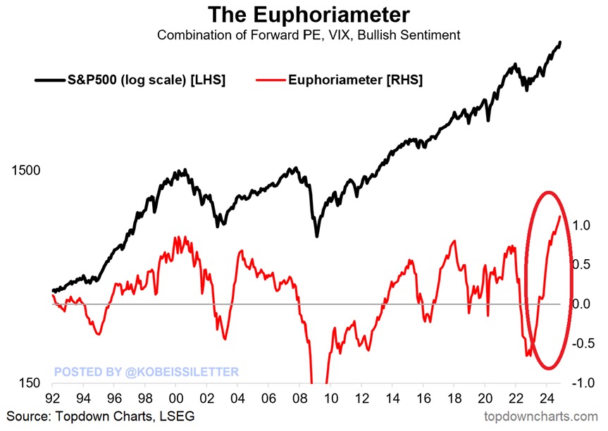 Et pour terminer ce ramassis de bonnes nouvelles, je vous apporte à la conclusion d’une semaine qui n’aura cessé de battre des records, on peut se référer à l’EUPHORIAMETER. Alors. L’Euphoriameter est un indicateur qui mesure le sentiment des investisseurs basé sur le ratio cours/bénéfice à terme du S&P 500, l’indice de volatilité et le « bullish sentiment » des investisseurs. Ensuite, ils mettent le tout dans un shaker (et pas à la cuillère) et on apprend donc que cet indicateur a atteint un niveau record ces derniers jours. Il a désormais dépassé le précédent record enregistré lors de la bulle Internet de 2000. Notons également qu’en l’espace de deux ans, le sentiment du marché est passé de la déprime à l’euphorie et durant cette même période, le S&P500 est monté de 50%.