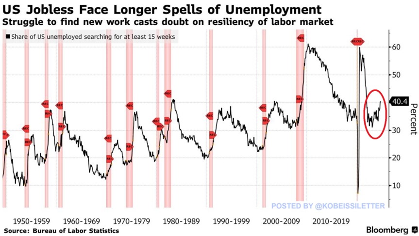 Il faudra aussi noter – comme le démontre le graphique ci-dessous qu’au cours des cycles économiques précédents, chaque fois que cette proportion a augmenté au rythme actuel, les États-Unis sont entrés en récession. Oups ! L’Amérique pourrait donc entrer en récession ??? MAIS BIEN SUR QUE NON !!! Puisque Trump va nous sauver. Bon, ceci dit, on se souviendra quand même que, parallèlement, 1.6 million d’Américains sont au chômage depuis plus de 27 semaines, soit le chiffre le plus élevé depuis février 2022. Conclusion : on peut le prendre comme on veut, on peut le retourner comme on veut, on peut l’interpréter comme bon nous semble, mais : Le marché du travail américain est en train de se planter dans l’ornière.