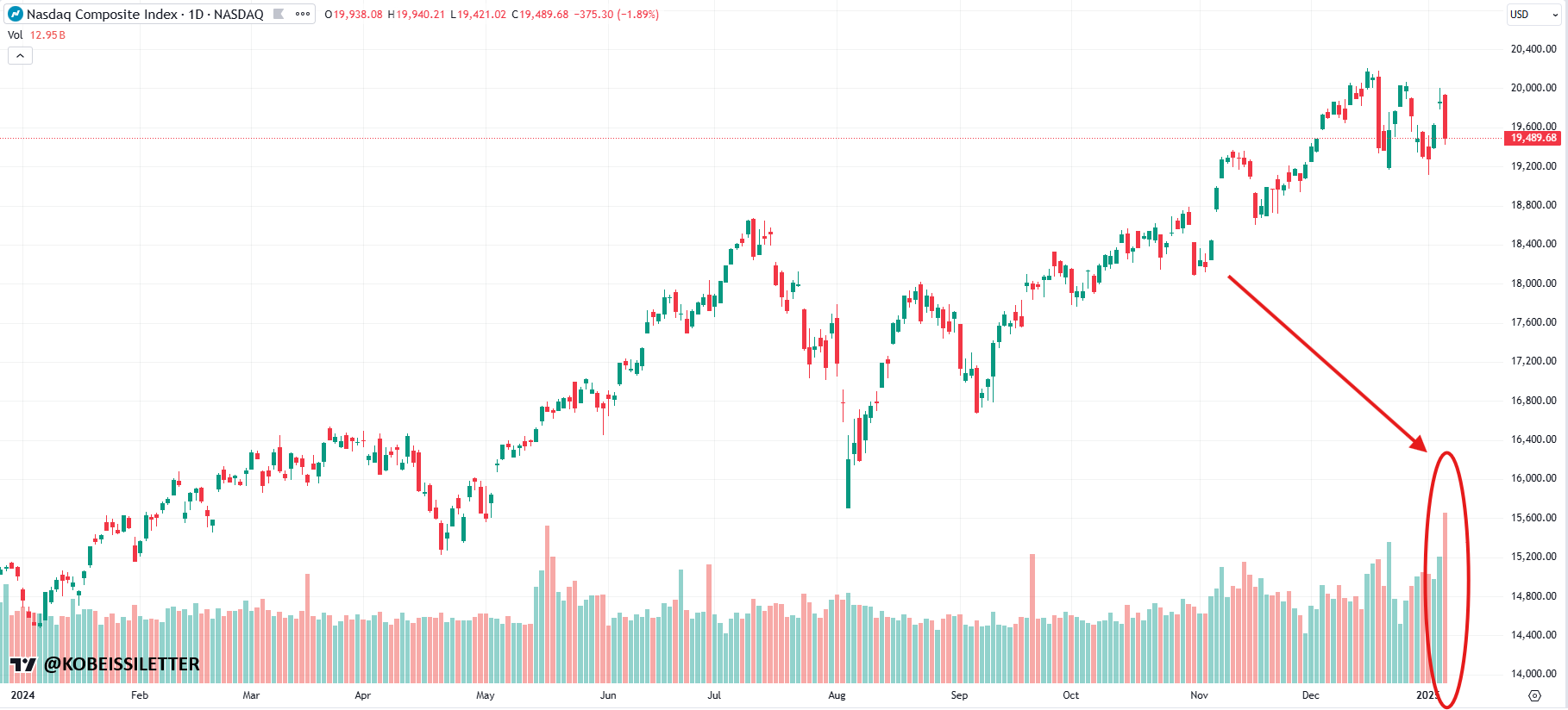 La suite vous la connaissez. Ou en tout cas vous voyez où je veux en venir. On a downgradé Tesla qui en plus se prend une enquête des autorités à cause d’un crash sous auto-pilote. On se rend compte que le déficit US est encore en train d’exploser un peu plus, que Zuckerberg va arrêter d’utiliser des « fact-checker » et que les réseaux sociaux seront de plus en plus livrés à eux-mêmes en mode « fête du slip à tous les étages » et tout le monde a appuyé sur le bouton SELL-SELL-SELL et SELL encore. Le Nasdaq a enregistré une baisse de 1.89%, mais surtout a battu son record de la plus grosse journée de trading avec un volume de 13’400 milliards de dollars, battant le précédent record obtenu en mai dernier qui était de 1’500 milliards de moins. Et pour couronner le tout, on parle de plus en plus d’un rendement du 10 ans à 5% dans les semaines à venir et plus PERSONNE n’attend la moindre baisse des taux aux USA avant Jackson Hole. Pour ceux qui ont oublié, Jackson Hole, c’est à la fin du mois d’août…
