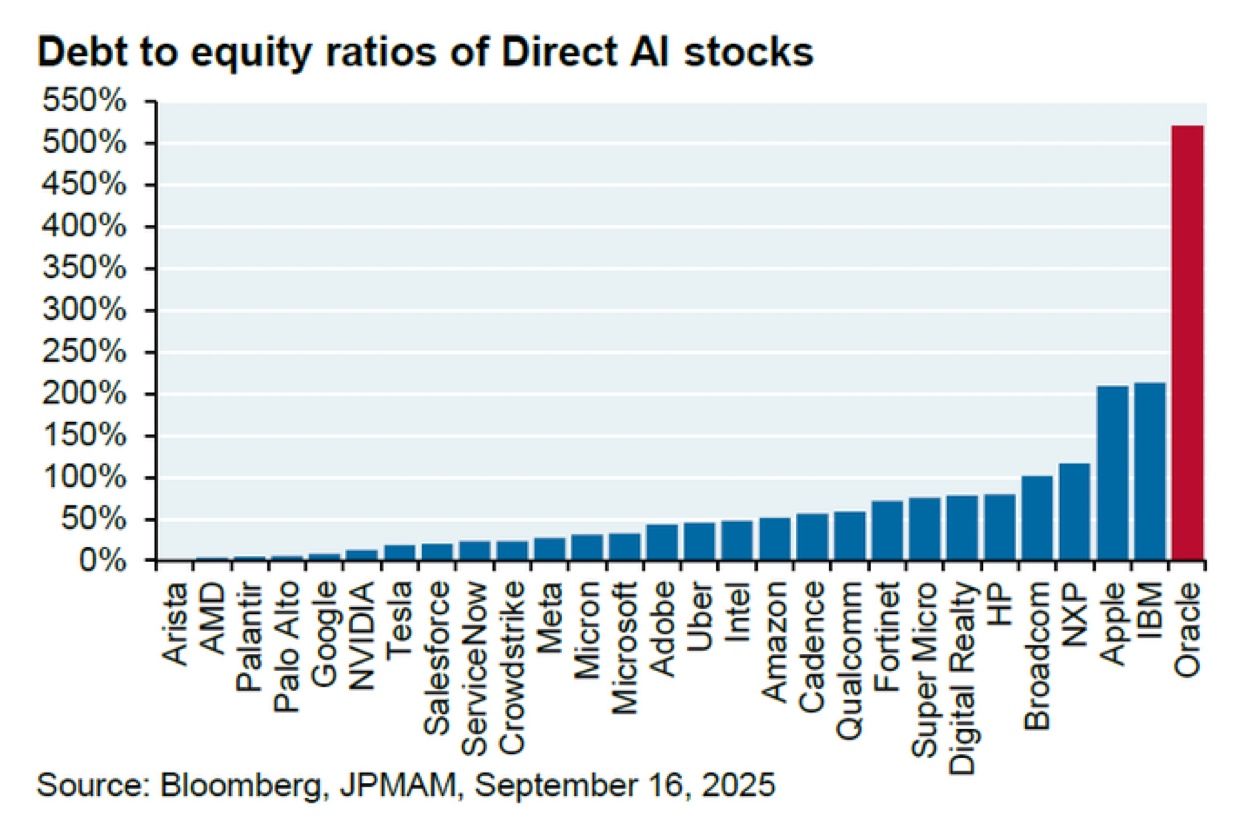 Et c’est dans cette atmosphère déjà bien chargée qu’Oracle est venue jeter un bidon d’essence sur le barbecue. Parce qu’il faut bien le dire : soudainement et depuis quelques jours, Oracle n’a plus l’air d’une société raisonnable, elle ressemble au gouvernement grec au début de l’année 2010. Les CDS d’Oracle montaient à la verticale, non pas comme un signal technique, mais comme un cri d’alarme, un hurlement strident dans la nuit, parce qu’on ne parle plus ici d’un petit dérapage comptable, mais d’un ratio dette/fonds propres qui atteint 500 %, un chiffre tellement absurde qu’il ressemble à une blague.