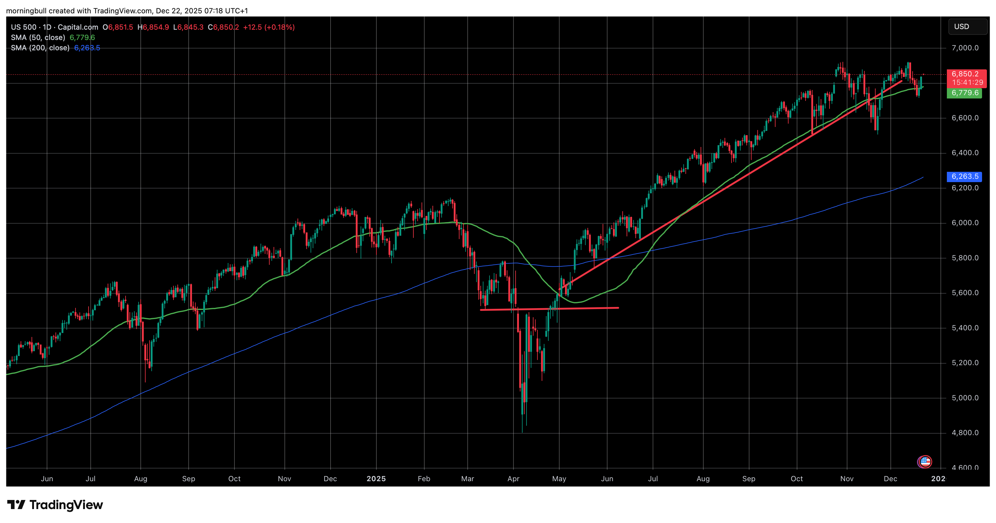 On ne va pas se mentir ; la semaine qui nous attend ne sera pas la plus excitante de l’année. Tout d’abord, la moitié du temps nous serons en train de digérer et l’autre moitié, on sera en train de préparer la soirée du 31 décembre. Autant vous dire que se concentrer sur les marchés et trouver le dernier titre à la mode pour ajouter à nos portefeuilles ne sera pas la préoccupation du moment. Pourtant, malgré qu’il reste peu de jours avant la fin de l’année, on pourrait bien être surpris par les indices qui semblent malgré tout extrêmement bien positionnés pour aller chercher les 7'000 points sur le S&P500, histoire de boucler cette année en fanfare et pour bien entamer 2026.