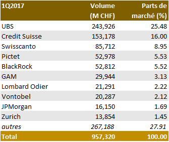 Les 10 plus gros acteurs représentent 72% du marché des fonds en Suisse.