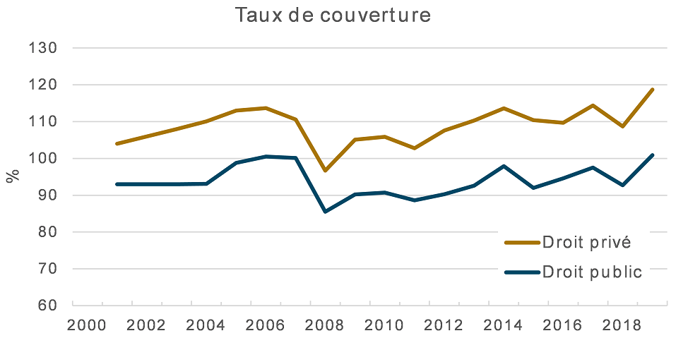 La santé des fondations de prévoyance n’a que peu évolué en termes de taux de couverture sur la période. Les taux de couverture des fondations de droit public restent aux environs de 100% et les fondations de droit privé sont en moyenne assez proches des 120%.