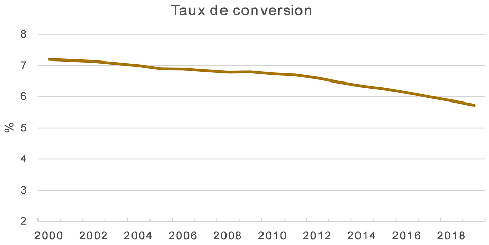 Les taux de conversion (sur la partie sur-obligatoire) ont baissé continuellement en 20 ans (-20% environ). Cette tendance s’est accentuée ces dernières années.