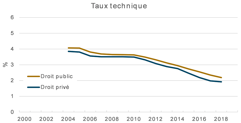 Nous pouvons faire la même constatation sur le taux technique qui se situe désormais en-dessous de 2%. Soit une baisse de 50% en 20 ans!