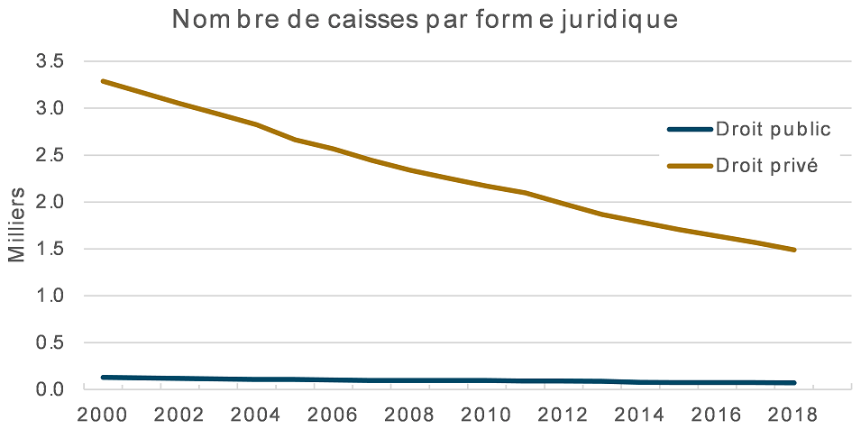 La pression règlementaire, la baisse des prestations et le travail toujours plus dense pour les membres des conseils de fondation conduisent progressivement à une modification du marché de la prévoyance. Le nombre de caisses de pension se restreint d’années en années. De 3418 caisses en l’an 2000 nous atteignons 20 ans plus tard moins de 1600 caisses. Soit une diminution de moitié des acteurs. La constatation et la proportion est similaire entre caisses privées et caisses publiques.