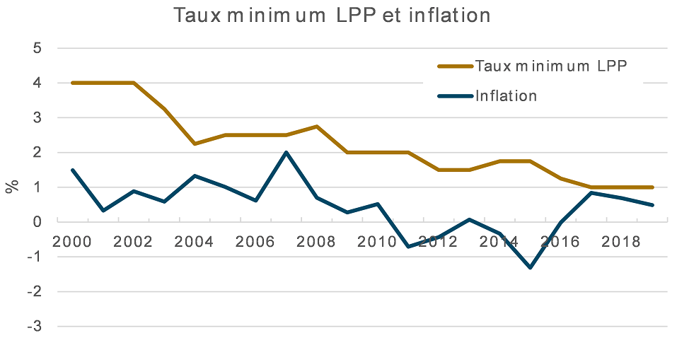 L’objectif du 2ème pilier, soit «maintenir le niveau de vie antérieur», a été atteint comme en témoigne le graphique suivant comparant le taux minimum LPP à l’inflation. Maintenir le niveau de vie signifie en effet avoir le même pouvoir d’achat dans le temps ou autrement dit offrir un taux de rendement au moins égal au taux d’inflation