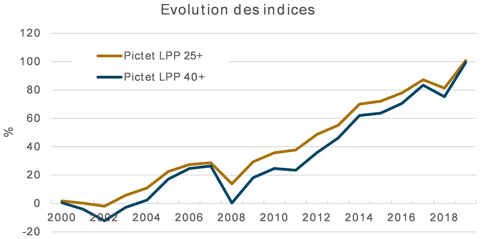 La performance des fondations est une des raisons de la croissance des actifs de prévoyance. Les indices Pictet LPP25+ et Pictet LPP40+, représentant respectivement une allocation de 25% et 40% en actions, sont une bonne représentation de l’univers des caisses de pension suisses.