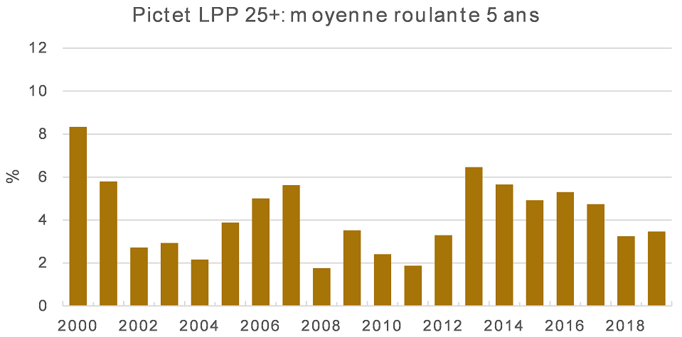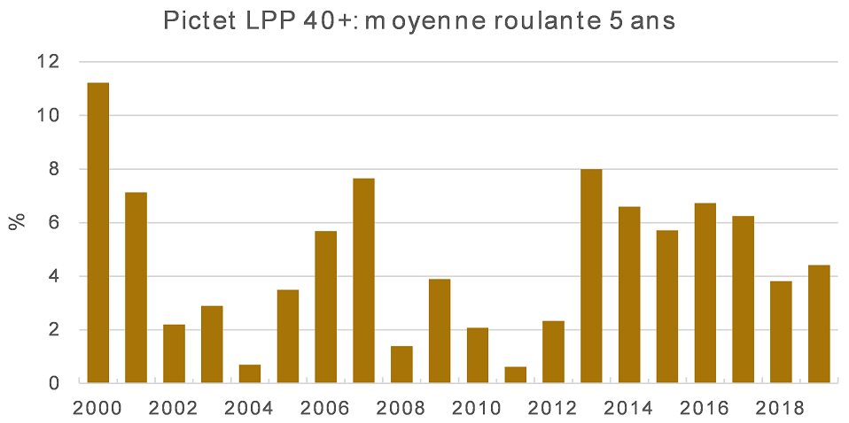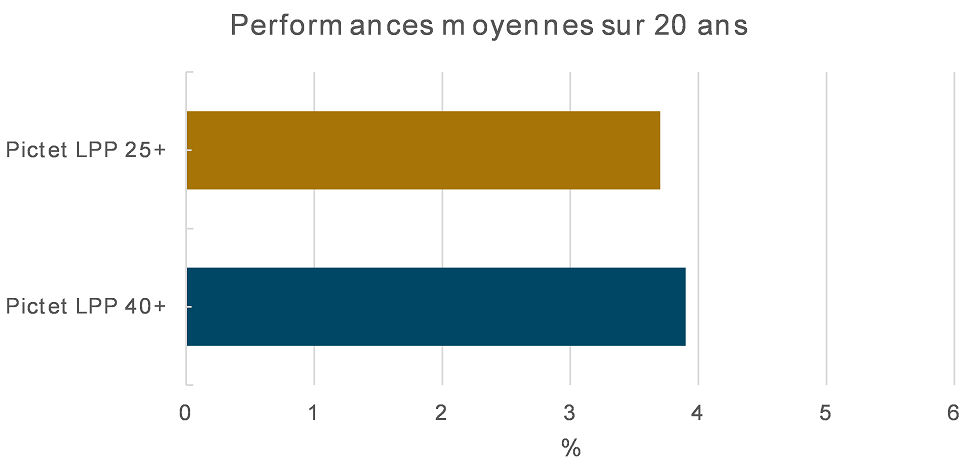 La performance annualisée moyenne sur la période dépasse pour les deux indices Pictet 3.5%. Elle est de 3.7% pour le Pictet LPP25+ et 3.9% pour l’indice Pictet LPP40+, soit au-dessus des taux d’intérêts techniques actuels.
