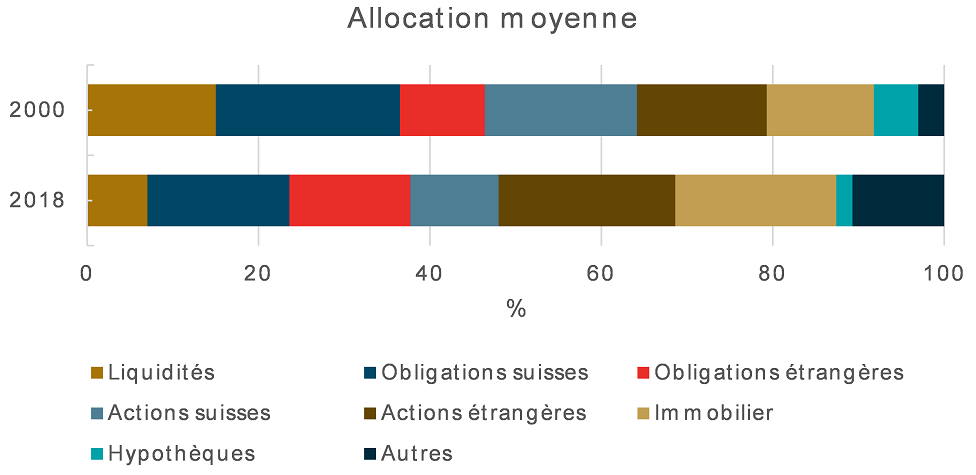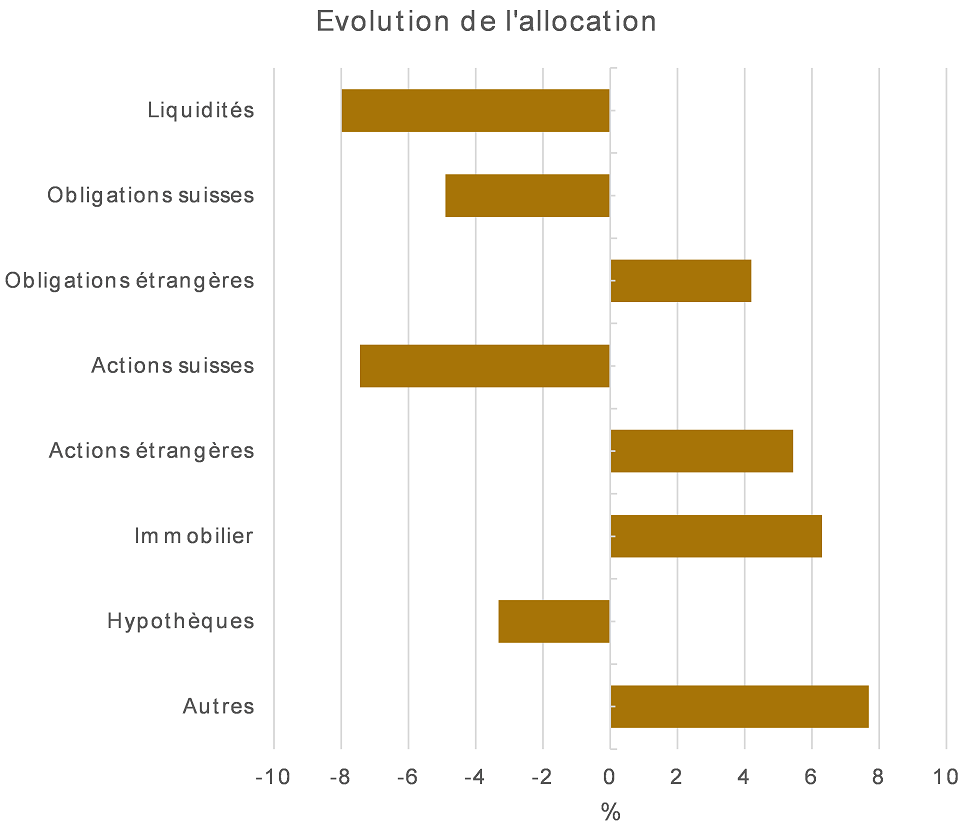 En termes d’allocations d’actifs les changements sont moins importants. Les liquidités ont été fortement réduites, en raison principalement des taux négatifs de la période récente. L’immobilier ou les stratégies alternatives sont en progression. On constate également un mouvement des actifs domestiques vers les actifs étrangers. Cette constatation peut être faite tant pour les obligations que pour les actions. Cette dynamique se retrouve dans tous les pays et devrait perdurer en Suisse compte tenu des taux négatifs et de la faible taille du marché national.