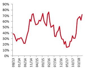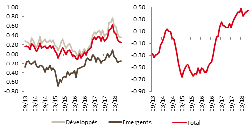 Si les fondamentaux macro-économiques restent bons, la guerre commerciale actuelle reste une source de préoccupation: elle pèse sur le sentiment des investisseurs, générant une montée du stress de marché. Ce qui commence à peser sur le moral des investisseurs, c’est le spectre d’un dérapage de la Chine, à l’image de 2015. Quel est le risque d’avoir un « bis repetita » d’août 2015? Sur le plan des fondamentaux, il y a peu de similitudes. Les économies développées sont actuellement en train de ralentir quand elles ronronnaient en 2015. Les économies émergentes connaissent une amélioration quand la plupart ralentissaient entre 2014 et 2015. Le niveau de croissance est également plus élevé aujourd’hui qu’il y a trois ans.