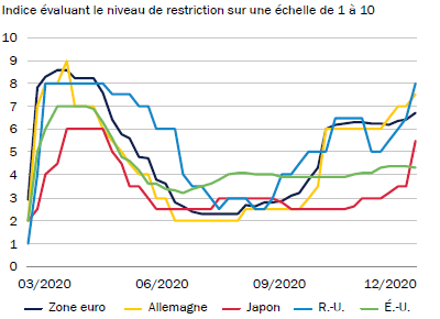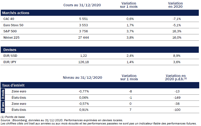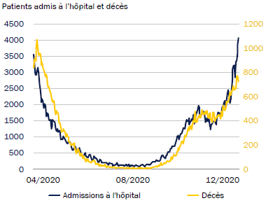 La gestion de la pandémie continue de mettre l’économie mondiale à l’épreuve. Dans l’hémisphère nord, la période des fêtes de fin d’année et le climat plus froid ont été propices à une résurgence des contaminations, forçant de nombreux pays à resserrer les mesures de restriction. Aux États-Unis, le nombre de nouveaux cas et de décès quotidiens atteint de nouveaux sommets mais, pour l’heure, aucune stratégie nationale n’a été déployée, chaque État restant souverain dans l’élaboration de sa stratégie de gestion de crise.