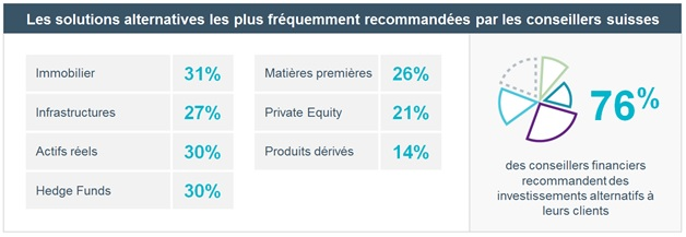 76% des conseillers suisses recommandent d’investir dans des investissements alternatifs pour améliorer la diversification des portefeuilles et réduire les niveaux de risque dans un environnement de marché de plus en plus volatil. Diverses stratégies sont déployées dans les portefeuilles des clients.