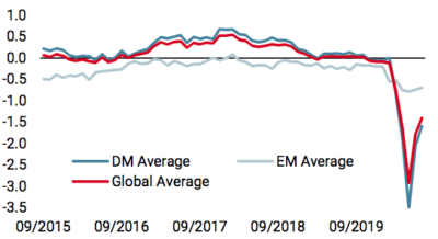 Premièrement, depuis sa mise en œuvre, l’expansion du bilan des banques centrales a conduit les actifs risqués à générer un rendement positif grâce au «portfolio channel» tel que décrit par H. Hannoun en 2015. Deuxièmement, notre analyse, basée sur un modèle de type Gordon et Shapiro qui décompose la prime de risque actions en différents facteurs, montre que les mesures prises par les banques centrales, qui ont augmenté le facteur d’actualisation grâce à la baisse des rendements obligataires et au resserrement des primes de crédit, ont compensé la baisse attendue de la croissance des bénéfices. À titre d’illustration, notre calcul montre qu’une baisse de 100 points de base des taux d’intérêt compense une baisse de 20% des bénéfices des 12 prochains mois (NTM). En cas de reprise en V de la croissance des bénéfices trimestriels qui se traduirait par une stagnation de la croissance des bénéfices NTM et un facteur d’actualisation inchangé, nos calculs donnent un niveau de 3 450 pour le S&P 500, soit environ 10% au-dessus du niveau actuel. Le rendement attendu sur la base de ce modèle est encore plus élevé pour les indices européens ou japonais. Nous sommes convaincus que le plan budgétaire extraordinaire mis en œuvre à l’échelle mondiale (environ 10% du PIB mondial est attendu) aidera les bénéfices à se redresser plus rapidement que les attentes du marché et des analystes et renforcera la reprise en V dans les prochains mois. C’est pourquoi nous surpondérons tactiquement les actifs axés sur la croissance dans nos portefeuilles multi-actifs.