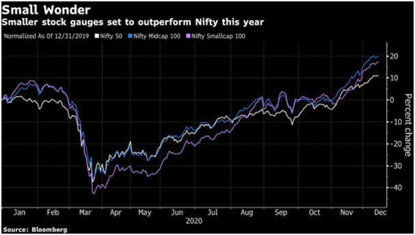 En effet, l’indice Nifty Midcap 100 – qui représente les entreprises de moyenne capitalisation en Inde – affiche une progression de 20% cette année alors que l’indice Nifty Smallcap 100 – celui des plus petites capitalisations boursières – a progressé de 17% en 2020.