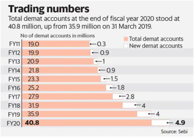 Y-a-t-il eu un effet covid? Le nombre de nouveaux comptes «demat» ouverts au cours de l’exercice 2020 est le plus élevé depuis au moins une décennie. En effet, 4,9 millions de comptes ont été ouverts en 2020, ce qui représente une augmentation de 22,5% par rapport aux 4 millions de comptes «demat» ouverts l’année précédente, d’après le Securities and Exchange Board of India. Le nombre total de comptes «demat» à la fin 2020 s’élève à 40,8 millions, contre 35,9 millions au 31 mars 2019.