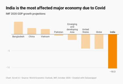 Avec le Covid et le confinement très strict imposé à la population en Inde, la croissance Indienne s’est littéralement effondrée en 2020. D’ailleurs, l’Inde est tout simplement le pays le plus affecté sur le plan de la croissance par le Covid parmi les plus grandes économies de la planète (graphique).