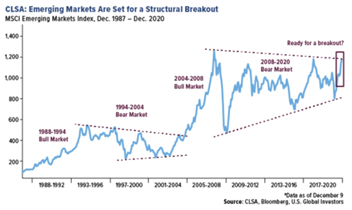 Alors que les actions émergentes ont sous-performé les actions américains ces dernières années, de nombreux stratégistes s’accordent à dire que la tendance relative pourrait se retourner en 2021. C’est le cas par exemple de CLSA qui table sur un nouveau marché haussier de l’indice MSCI Emerging Markets après des années de disette.