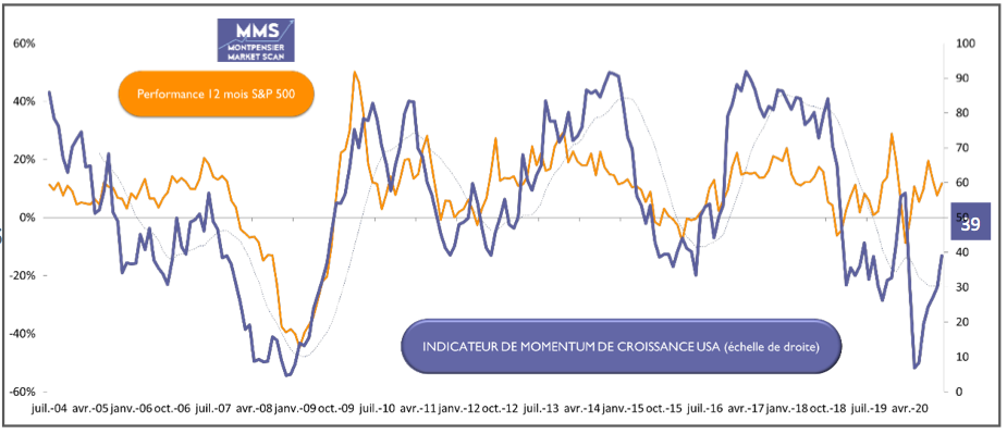 Or l’économie américaine, si elle a très fortement rebondi depuis quelques mois, n’est pas tirée d’affaire. L’emploi se redresse vite mais il manque encore près de 8 millions de créations de postes pour retrouver le niveau de janvier 2020; l’immobilier est dynamique mais les retards de paiement de loyers se multiplient; le moral des consommateurs reste bon mais les prévisions d’investissement se trainent et le secteur des services reste très affecté par l’épidémie. Notre indicateur MMS Montpensier de Momentum économique, à 39, peine à accélérer.