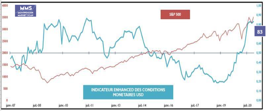 La prochaine réunion, le 15 décembre, au lendemain du vote par le collège électoral, sera décisive et devrait signaler une amplification du soutien. Il est nécessaire: alors qu’il a progressé de près de 70% en quelques semaines entre mars et avril, le bilan de la Fed est quasi stable depuis le début de l’été. Notre indicateur MMS Montpensier de conditions monétaires montre d’ailleurs clairement que l’environnement financier est maintenant soutenu davantage par la baisse du dollar que par l’action de la FED.