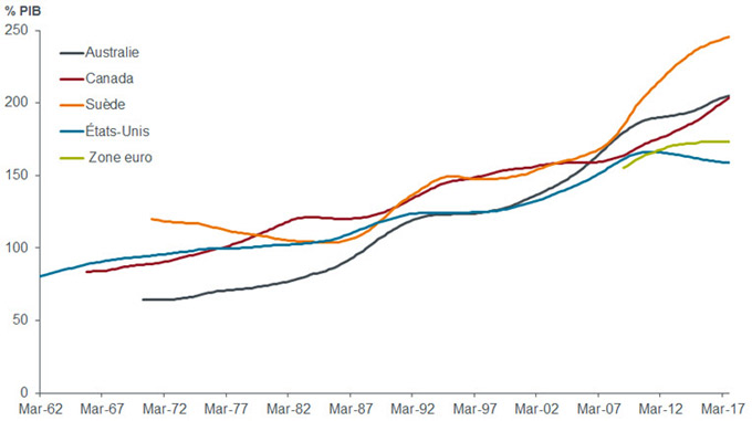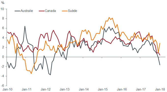 Les économies australienne, canadienne et suédoise ont ceci en commun qu’elles sont désynchronisées par rapport au désendettement des consommateurs observé ces dernières années dans la plupart des pays développés. L’accumulation de dette privée en résultant est frappante (voir graphique 1) et retient notre attention depuis un certain temps déjà, car elle suggère que ces économies sont en fin de cycle et, partant, plus fragiles structurellement parlant face à la hausse des taux d’intérêt.