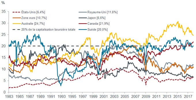 Les systèmes bancaires de ces économies présentent également des signes d’excès, comme le souligne Absolute Strategy Research. Dans ces trois économies, la taille du secteur bancaire a fortement augmenté et représente désormais environ 20% de la capitalisation boursière, ce qui constitue en règle générale un signal d’alarme dans le cadre des bulles immobilières (voir graphique 2).