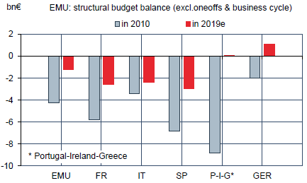 Là encore, il faut revenir aux chiffres et avoir un minimum de mémoire des événements des dix dernières années. En excluant l’Allemagne, le solde budgétaire des pays de la zone euro est passé d’un déficit de près de 8% du PIB début 2010 à 1.5% du PIB début 2019. Sur cette période, la charge de la dette a certes beaucoup baissé du fait des taux de refinancement plus bas. Toutefois, pour une large part, la réduction des déficits publics est le fruit d’un effort structurel, pas seulement la conséquence du rebond du cycle et de la baisse des taux d’intérêt (graphe). Dans plusieurs pays, il est permis de penser que l’ajustement imposé dans le cadre de programmes de bailout a été trop strict, et ce faisant, a différé la reprise de la zone euro. Le FMI a fait son mea culpa à ce propos il y a déjà plusieurs années. Quant aux réformes structurelles, comme leur nom l’indique, il faut souvent un long délai avant d’en évaluer tous les effets, mais il est contraire à la vérité de dire que rien n’a été fait, qu’il s’agisse du fonctionnement des marchés du travail (Espagne, France) ou de l’assainissement des secteurs bancaires (Espagne, Italie, Irlande, Portugal, Grèce).
