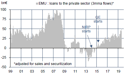 Pour la BCE, la question clé est de savoir si le manque de profitabilité des banques empêche la transmission de la politique monétaire vers l’économie réelle. Les données de crédit ne permettent pas de mettre en évidence un lien robuste entre vigueur du crédit et profitabilité (le cas allemand est un exemple flagrant). De manière générale, le rythme des prêts bancaires au secteur privé en zone euro ne montre aucun signe de fléchissement, à mesure que la politique monétaire est de plus en plus assouplie. Plutôt le contraire (graphe).