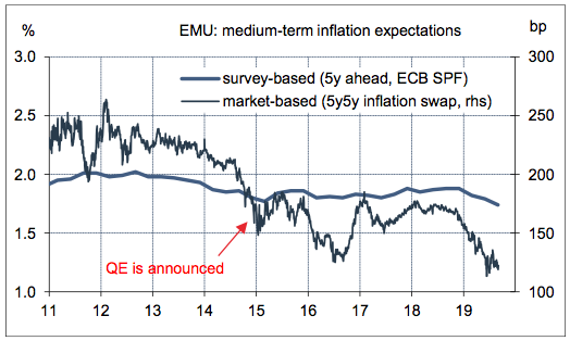 Durant l’été, la situation économique de la zone euro ne s’est ni améliorée, ni vraiment dégradée, ce qui signifie qu’elle reste fragile dans l’ensemble (cf. graphe), avec un biais baissier plus net en Allemagne(2). Certains facteurs d’incertitude ont reflué, comme le risque politique en Italie; d’autres demeurent tout aussi difficiles à appréhender de manière sensée, comme le Brexit(3); d’autres enfin se sont aggravés, comme les frictions commerciales sino-américaines. Enfin, et ce n’est pas la moindre des préoccupations pour la BCE, ni l’inflation actuelle, ni l’inflation anticipée ne se redressent. En triturant les indices de prix, on voit une ébauche de redressement sur les composantes cycliques de l’inflation(4) mais l’image d’ensemble est que l’inflation reste bien trop éloignée de la cible. Les anticipations d’inflation à moyen terme sont plus basses qu’en 2014 (cf. graphe). À l’époque, il était fréquent de parler de déflation et même si ce risque était peut-être surestimé, la faiblesse de l’inflation anticipée avait alors conduit la BCE à lancer son premier programme d’achats d’actifs.