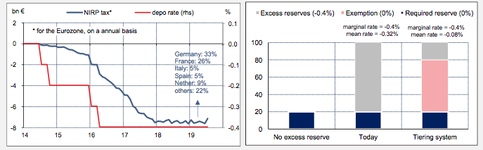 Taux (négatif) – Une baisse du taux de dépôt est une quasi-certitude. Beaucoup y sont favorables par conviction que cet outil est utile, d’autres car cela leur donne un argument pour refuser d’autres mesures comme le QE. Au demeurant, on voit mal pourquoi après des baisses de taux un peu partout dans le monde, la BCE serait la seule banque centrale à se priver de cette option, au risque d’une appréciation de l’euro. Accentuer la politique de taux négatif (NIRP) est comme on sait très mal vue du côté des banques. C’est pourquoi il est probable qu’une baisse des taux sera accompagnée de mesures visant à en limiter l’impact sur les profits des banques, en créant un système de taxation par paliers de leurs réserves excédentaires (voir Encadré). L’amplitude de la baisse reste à fixer (on penche plutôt vers -10bp, avec le maintien d’un biais baissier).