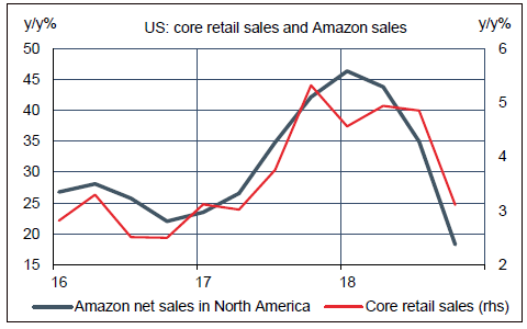 Comment expliquer un tel coup de froid? Il est possible que les chiffres définitifs soient corrigés à la hausse, mais cela jouerait à la marge. Notons d’ailleurs que la faiblesse se voit aussi dans les ventes d’Amazon (graphe). Difficile donc d’incriminer une large erreur de mesure. L’explication tient plutôt à la combinaison de deux chocs. On peut en estimer les impacts.