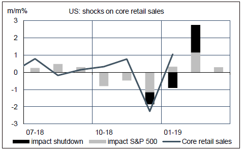 Secundo, le shutdown. Environ 800.000 employés fédéraux (0.5% de l’emploi total) n’ont pas été payés pendant environ un-tiers du mois de décembre. Si l’on suppose là aussi que les dépenses de services n’ont pas été trop affectées, l’impact sur les ventes au détail serait de -0.7pts. En janvier, la bourse s’est reprise modestement si on considère la moyenne mensuelle, de quoi booster les ventes de 0.2pts. Le shutdown a continué jusqu’au 25 janvier, donnant une contribution négative de 0.9pts. Combinant ces deux facteurs, on a un impact maximal de -1.4pts en décembre et -0.5pts en janvier. Cela donne l’espoir d’un solide rebond en février (graphe), même s’il semble, au vu du rapport sur l’emploi, que les conditions météo ont causé des perturbations ce mois-ci. Volatilité mise à part, les ménages vont continuer de bénéficier d’une évolution favorable de leur revenu disponible (créations d’emploi, gains salariaux, inflation basse) mais la tendance se tasse. La croissance de la consommation, et donc celle du PIB, avait tangenté 3% en 2018, il serait logique de se diriger vers 2% à la fin 2019.