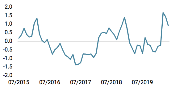 Notre préférence pour ces expositions n’est pas sans risque (sinon, tout le monde ferait de même). Premièrement, la valorisation est clairement un risque: le ratio cours/bénéfice (P/E) à douze mois pour le Nasdaq est de 25,0 contre 20,4 pour le S&P 500. Même si l’on considère que le Nasdaq est généralement valorisé à un niveau plus élevé que le S&P, cela ne change rien au tableau : par rapport à leur propre histoire, le ratio cours/bénéfice actuel du Nasdaq se situe à son 95e centile, contre le 90e centile pour le S&P 500. Le P/E du SMI se situe actuellement à 16,4, un peu au-dessus des 14,6 de l’Eurostoxx 50, bien que l’image soit meilleure par rapport à leur histoire (le SMI est à son 87e percentile alors que l’EuroStoxx 50 est à son 96e percentile). En outre, il existe un risque de positionnement excessif, car le Nasdaq et le SMI ont tous deux surpassé le S&P 500 et l’EuroStoxx 50 à de nombreux horizons: 5 ans, 3 ans, 1 an, YTD, 2020 pré-coronavirus (janvier 2020-19 février 2020), crise du coronavirus (20 février 2020-23 mars 2020), et crise post-coronavirus (24 mars 202 -15 mai 2020). Il est intéressant de noter que nos mesures du positionnement net des spéculateurs au Nasdaq par rapport à S&P sont plus positives, car ils semblent moins exposés au Nasdaq qu’au S&P qu’ils ne l’ont été récemment.