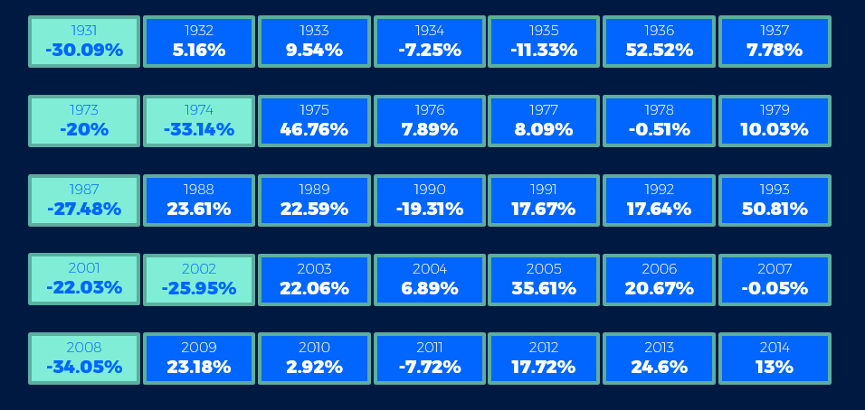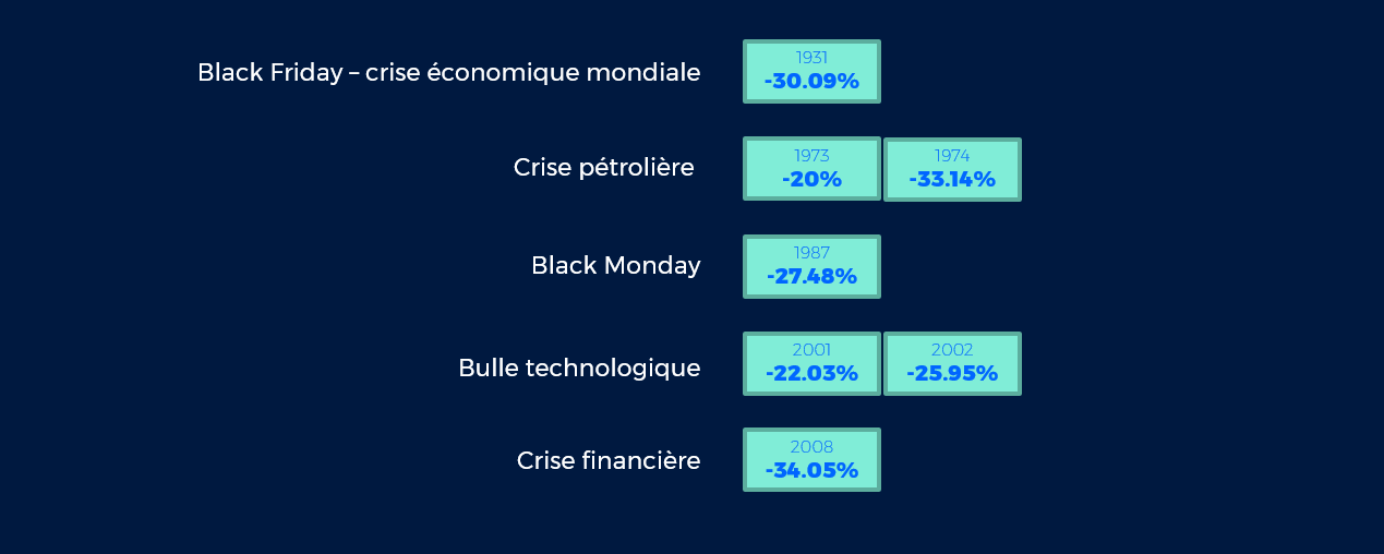 Depuis 1926, le marché suisse des actions a connu cinq phases de baisse massive, dont deux au cours de deux années consécutives. En nous basant sur l’exemple de notre marché suisse, nous allons vous démontrer que 5 ou 6 ans après chaque phase de «bear market», il est possible de retrouver une rentabilité globale positive et tout à fait correcte. Qui plus est, ceux qui ont profité de ces marchés si baissiers pour investir encore davantage ont pu augmenter fortement la performance de leur portefeuille.