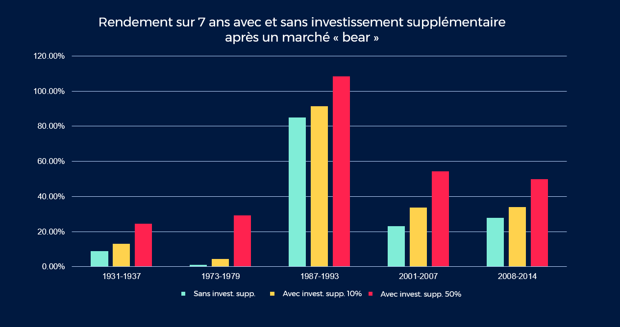 Exemple: si début 2011 (donc avant le crash), vous aviez investi un montant de CHF 100 000 en actions suisses, sept ans plus tard la valeur de votre dépôt aurait été de CHF 123’207, et ce malgré la forte correction boursière des années 2001 et 2002. Si vous aviez profité des deux années «bear» pour effectuer à chaque fois un investissement supplémentaire à hauteur de 50% du montant initial du placement (donc CHF 50’000 chaque année), la valeur du dépôt fin 2007 aurait été de CHF 308’914. Cela correspond à une performance de presque 54%, donc nettement supérieure à celle réalisée sans investissement subséquent.