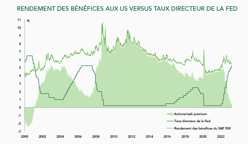 Nous craignons que cette fuite vers un rendement sûr de plus de 5% n’incite bientôt les investisseurs en actions à se tourner vers les liquidités. Le cash n’a été une alternative aussi attrayante aux actions qu’à deux reprises au cours de ce siècle : en 2000, lors de la bulle technologique, médias et télécommunications (TMT), lorsque la prime actions/cash est devenue négative, et en 2007, juste avant la crise financière mondiale. Aucune de ces deux périodes ne s’est bien terminée pour les investisseurs en actions, et nous craignons qu’une issue similaire ne se dessine pour les marchés aujourd’hui.