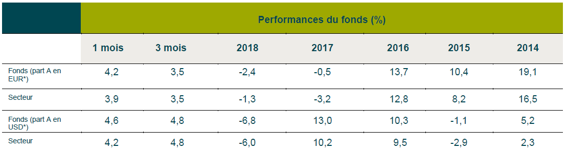 A la fin du mois, le fonds était investi à hauteur de près de 42 % dans la dette souveraine en devise forte, de 26 % dans les emprunts d’État en devise locale et de 26 % dans les obligations d’entreprises en devise forte. Le reliquat du fonds était détenu sous la forme de dette d’entreprises en devise locale et de liquidités. Les plus fortes expositions aux devises émergentes concernaient notamment le real brésilien, le rouble russe, la roupie indonésienne, la roupie indienne, la lire turque et le baht thaïlandais. L’allocation du fonds au dollar américain était quant à elle de 67,4 %.