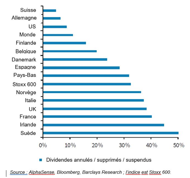 La France est un exemple emblématique avec pas moins de 2/3 des sociétés du CAC 40 réduisant ou supprimant leur versement annuel. Si les coupes de dividendes sont monnaies courantes en période de récession (il en a été de même durant la grande crise financière de 2008/2009 par exemple) une caractéristique particulière de cette crise est le nombre sans précédent de coupe de dividendes pour les «dividend aristocrats».