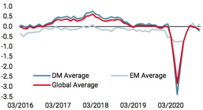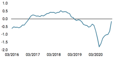 Où est passé l’argent? Essentiellement dans l’épargne, tant du côté des consommateurs (+13,6% du revenu disponible des ménages aux États-Unis par exemple) que des entreprises (parmi les entreprises américaines, leur niveau de liquidités a augmenté de 2% de leurs revenus). La consommation mondiale est probablement sous-estimée. Les économistes privés prévoient une croissance de 4,6% de la consommation aux États-Unis et dans la zone euro l’année prochaine, ce qui implique pour les deux zones respectivement un excédent de +2,4% et de +3% sur leurs tendances à long terme. À notre avis, c’est peu probable. La consommation devrait augmenter plus rapidement que cela, en particulier aux États-Unis: une croissance de la consommation supérieure à 5% au premier semestre ou en 2021 ne nous surprendrait pas.