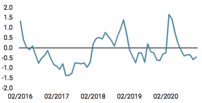 Avec la poursuite de l’amélioration macroéconomique, on peut se demander si le sentiment est déjà au plus haut, les investisseurs anticipant un contexte aussi positif? Non, et cela peut être vu sous de multiples angles. Premièrement, malgré la baisse actuelle du VIX, la structure des échéances de ses contrats à terme reste en pente ascendante et l’extrémité de la courbe reste assez élevée par rapport aux normes historiques (les contrats à terme d’août 2021 étaient encore à environ 26% à la fin de décembre 2020). Deuxièmement, le skew de la courbe du VIX, donnant une idée du degré de protection des investisseurs contre une baisse ou une hausse des marchés boursiers, penche toujours fortement vers une protection à la baisse. Enfin, le positionnement des investisseurs sur les actifs de croissance – et notamment les hedge funds et les CTA macro mondiaux – a encore une marge de manœuvre importante avant que l’on puisse dire que la normalisation du positionnement est terminée. L’histoire nous enseigne que cette reprise peut prendre du temps et, malgré la violente reprise en forme de V à laquelle nous avons assisté, la poursuite de cette normalisation prendra du temps.