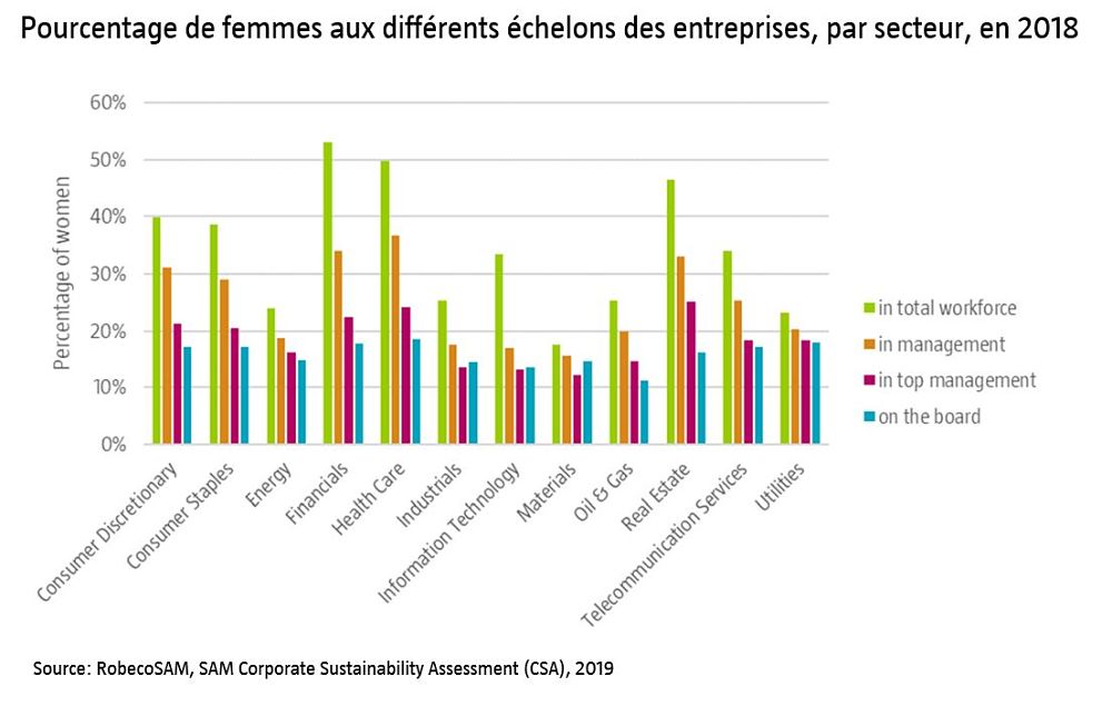 Pour son étude, RobecoSAM a analysé une série de données unique réunissant plus de 20 720 observations annuelles collectées entre 2013 et 2018 auprès d’entreprises dans le cadre de la SAM Corporate Sustainability Assessment (CSA), une méthode d’évaluation des critères ESG qui vise à mesurer la durabilité. Tous secteurs confondus, les données de 2018 montrent un écart considérable entre le pourcentage de femmes occupant une fonction de direction et celui, nettement plus élevé, de femmes dans l’effectif total. La comparaison de la part de femmes occupant des postes d’encadrement et dans l’effectif total donne un résultat comparable, ce qui confirme cet état de fait : plus on monte dans la hiérarchie des entreprises, plus les femmes sont rares.