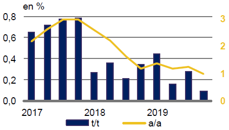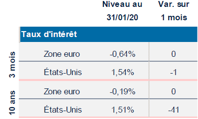 Par ailleurs, si les données provenant des sondages d’opinion – Croissance du PIB auprès des entreprises peuvent légitimement entretenir l’espoir, les statistiques macroéconomiques mondiales ne montrent guère, pour le moment, une franche inflexion de l’activité réelle, l’exemple le plus probant se situant en zone euro. Selon une première estimation publiée à la mi-janvier, la croissance économique y aurait poursuivi son essoufflement au T4 2019, le PIB enregistrant sa plus faible croissance (0,1% t/t) depuis 2013.