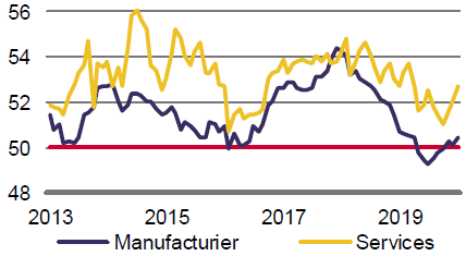 Galvanisés par de timides signes d’une possible amorce de stabilisation de l’activité économique, les investisseurs semblent convaincus qu’un rebond de la croissance mondiale en 2020 est une quasi-certitude. En effet, la résilience du secteur des services s’est poursuivie, soutenue par la faiblesse des taux de chômage et une hausse, quoique modeste, des salaires.