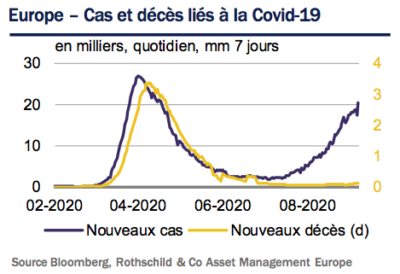 des nouveaux individus infectés. Au vu de la corrélation importante entre l’âge et le taux de mortalité, cette nouvelle vague d’infection exercera à priori une moindre pression sur les systèmes de santé. En outre, l’amélioration des thérapies et des techniques de traitement a réduit le taux de mortalité des personnes hospitalisées. Ainsi, la deuxième vague de Covid-19 en Europe semble bien distincte de la première, justifiant la mise en place d’une approche différente par les gouvernements. En particulier, ces derniers se sont concentrés sur le traçage des cas positifs et accentué encore davantage l’importance du port du masque. Pour autant, bien que la probabilité d’un nouvel arrêt généralisé de l’activité économique soit mince, la récente résurgence représente un frein pour l’activité économique.