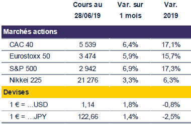 Même les États-Unis, jusqu’ici épargnés, ont subi une détérioration généralisée – quoique très graduelle – de leurs statistiques économiques. Plus globalement, l’investissement et les échanges internationaux ont été plus faibles qu’escompté au début de l’année, la grande faiblesse des taux souverains témoignant d’ailleurs d’une dynamique fragile et exposée à des risques importants. Pour autant, le marché d’actions continue de croire au rebond anticipé de la croissance au second semestre, à mesure que se dissiperaient les incertitudes et sous l’impulsion de Banques centrales résolument accommodantes.