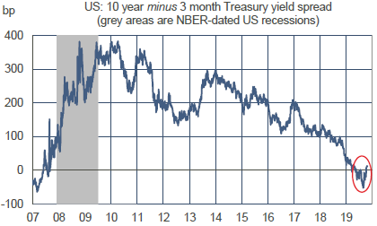 Les données récentes pointent vers une croissance sous-optimale, au voisinage de 1.5% l’an, mais non pas un arrêt et à plus forte raison une contraction de l’activité. La courbe des taux qui était le signal le plus alarmant a repris une forme plus normale, en réponse à la baisse des taux courts (graphe du haut). Il y aurait de quoi temporiser.